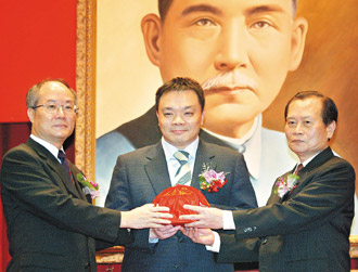 臺當局“法務部”上午舉行“部長”交接典禮,監視人臺當局“行政院政務委員”高思博(中)從“代理部長”黃世銘(左)手中接過印信,并轉交給新任“部長”曾勇夫(右)。圖片來源:臺灣《聯合晚報》