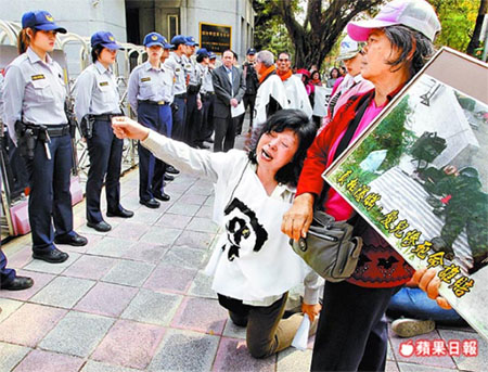 蔡學(xué)良母親尤瑞敏昨日到臺空軍司令部前抗議,跪地痛哭要求臺空軍司令給真相。 來源:臺灣《蘋果日報(bào)》