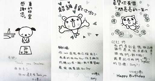 左:給老師和同學曹姓女童寫給老師的遺書,告訴老師“謝謝你”。中:女童遺書還寫給自己最喜歡的班上男生,說不在意他去找陳某某,而且還是很愛著他。右:寫給同班“GIRL們”的卡片,告訴好姊妹當她們看到這張卡片時,“我已經走了”。圖片來源:臺灣《聯合報》