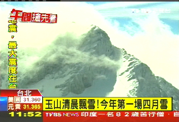 玉山氣象站技士康明山指出,2000年玉山曾下過一場“5月雪”,最近10年4、5月份下雪則相當罕見。玉山去年4月16、17日清晨也曾短暫飄降“4月雪”,但到近午時分積雪即完全融化。