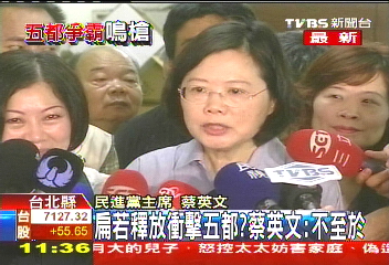被問及如果明天(陳水扁)被釋放,是否會會沖擊選情。民進(jìn)黨主席蔡英文說,“我覺得不至于啦,因為,經(jīng)過這兩年來的沉淀,還有很多我們的思考,陳水扁的這個案子,現(xiàn)在大家思考都比較成熟,面對這個問題也都比較沉穩(wěn),我不認(rèn)為這個問題在我們五都選戰(zhàn)里面,會有什么很大的沖擊。”