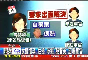 報(bào)道稱,2008年4月,陳姓軍官與朱姓軍官先后和馬姓女子交往。不料,雙方發(fā)生性關(guān)系后,馬女謊稱懷孕要墮胎、誣告性侵害,還說(shuō)自己任職平面媒體和黎智英熟識(shí),可以把新聞鬧大,要對(duì)方花錢消災(zāi)。
