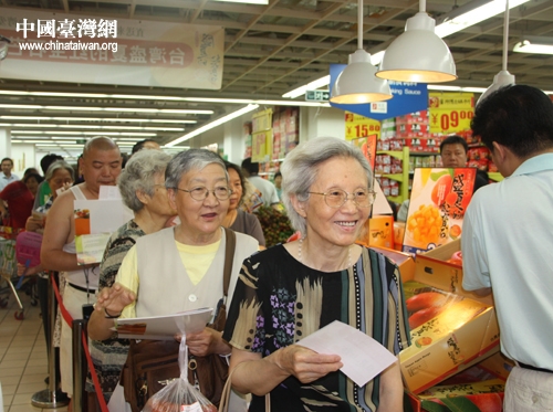 蘇煥智夫婦熱心當(dāng)起推銷員,向到場市民介紹并現(xiàn)場贈送芒果。(中國臺灣網(wǎng) 李學(xué)斌 攝)
