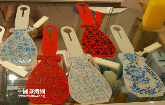 圖為第三屆海峽兩岸文博會臺灣文創(chuàng)展區(qū)展出的,仿中國瓷器造型的硅膠行李牌。(中國臺灣網(wǎng) 張弛 攝)