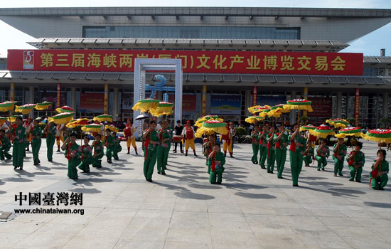 文藝團體在會場前表演節目慶祝第三屆海峽兩岸文博會開幕。(中國臺灣網 張弛 攝)