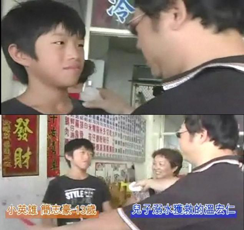 家在花蓮市開眼鏡行的溫宏仁表示,前天接到醫院急診室電話,才知道兒子溫定超跟著其它同學跑去海邊玩水,“溺水差一點就回不來”。看了媒體報道,獲悉是簡志豪救了兒子,昨天特別帶了紅包及豬腳面線跑到簡家開的面店當面致謝。