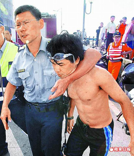 林身茂(右)體力耗盡,只能乖乖上岸,遭警方扭送法辦。圖片來源:臺灣《蘋果日報》