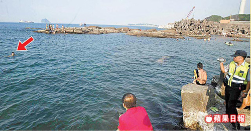 林身茂(箭頭處)偷窺后跳下海躲警,與在岸邊的警方僵持不下。