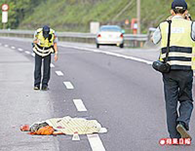 臺灣昨天清晨,在某高速公路段一男子遭車禍,橫尸路面頭顱爆碎。圖片來源:臺灣《蘋果日報》