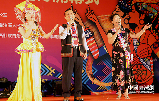 極具民族風(fēng)情的原生態(tài)山歌對唱、銅鼓舞,技藝非凡的雜技“轉(zhuǎn)碟”等表演之精彩,讓兩岸嘉賓領(lǐng)略到廣西獨(dú)特的風(fēng)俗民情,拍掌叫好聲不斷。熱烈的氣氛,讓遠(yuǎn)道而來的臺灣嘉賓不禁有些“技癢”,也一試身手,與當(dāng)?shù)匮輪T同唱起《北部灣情歌》。