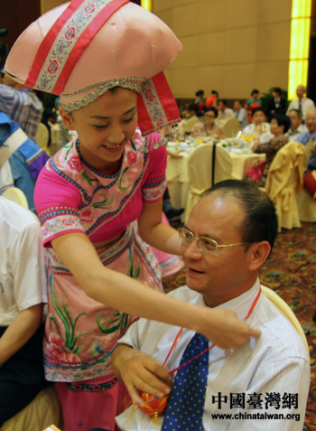 “情系八桂——兩岸文化聯(lián)誼行”聯(lián)歡晚會16日晚在南寧舉行,圖為壯族姑娘為臺灣嘉賓送上寓意友誼長久的“繡球”。(中國臺灣網(wǎng) 張弛 攝)