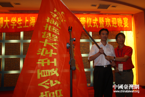 國臺辦交流局副局長嚴(yán)中洲為夏令營團(tuán)長陳宗韓授旗。(中國臺灣網(wǎng) 肖燕 攝)