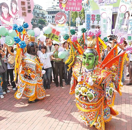 參選人還請(qǐng)來(lái)電音三太子助陣。來(lái)源:臺(tái)灣《中國(guó)時(shí)報(bào)》