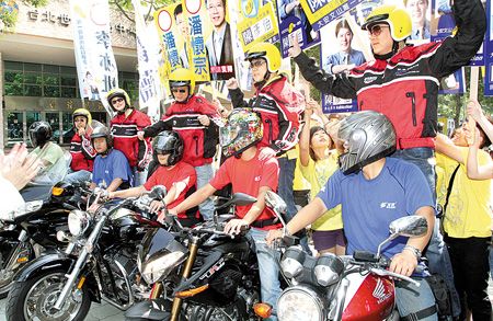 新黨市議員參選人集體乘坐重型摩托車抵達(dá)現(xiàn)場(chǎng)造勢(shì)。來(lái)源:臺(tái)灣《中國(guó)時(shí)報(bào)》