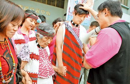 在臺(tái)北市選委會(huì)外,有臺(tái)灣少數(shù)民族市議員參選人身著傳統(tǒng)服裝,在耆老與族人的陪同下前往登記。來(lái)源:臺(tái)灣《中國(guó)時(shí)報(bào)》