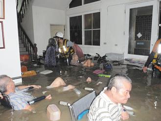 高雄縣晉德贍養(yǎng)中心19日傍晚灌入大水,31名行動(dòng)不便的老人受困,業(yè)者奮力搶救10余人上二樓,眼見大水來的太快,擔(dān)心救援不及,緊急聯(lián)系消防隊(duì)救人。