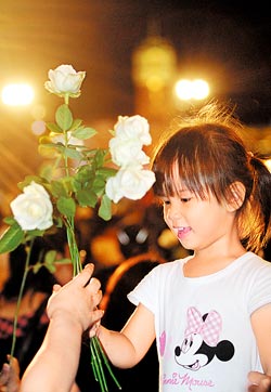 中國臺灣網9月26日消息 綜合臺灣媒體報道,由于幼童遭性侵案的嫌犯接連被輕判,臺灣民間團體和網友昨(25)日晚間6時在臺灣凱達格蘭大道舉行了“白玫瑰運動集會”,9時30分準時結束。上萬民眾身著黑上衣,手拿白玫瑰,牽著穿著象征純潔白衣的小朋友到場參與,要求擴大性侵害保護對象,淘汰不適任法官,并建立性侵案件專家證人制度。