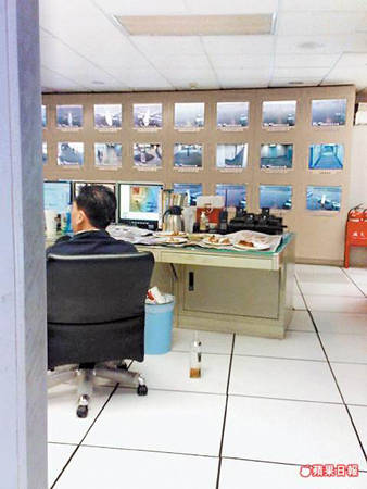 臺灣桃園機場中控中心督導李鑒敏(左)在中控中心內,與外包廠商女員工喝酒調情,動作極為親密,無視旁人在場。資料圖片