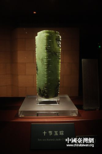 十節(jié)玉琮。由一塊質(zhì)地細(xì)密的上佳整玉雕琢完成,通體呈淡青綠色,九條細(xì)小的橫槽將器身分為十節(jié),每節(jié)棱角上均刻有紋飾。有專家認(rèn)為,此玉琮比金沙遺址更早1000年。(中國(guó)臺(tái)灣網(wǎng) 馬迪 攝)