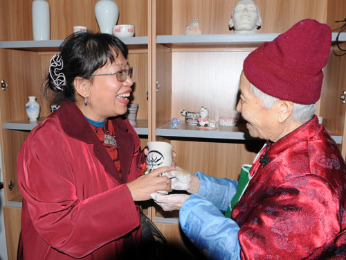 83歲的老人彭朝珍還將親手制作的四川臉譜圖案筆筒送給陳芳姿。圖片來源:四川省臺辦