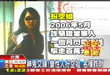 日前,變性人被臺南市地方法院逮捕,判刑1年3個月。法官表示,這名變性人犯案累累,她曾假扮空姐、檢查員等詐騙多名男子。變性人曾以美人計,同時周旋在4名癡情男之間。(中國臺灣網 馮存健)