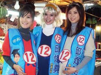 中國臺灣網11月25日消息 據臺灣“今日新聞網”報道,臺灣五市(臺北市、新北市、大臺中市、大臺南市、大高雄市)選戰進入最后階段,候選人拉票各出奇招!罢笏募А24日為議員候選人助選時,特別打扮成孕婦,以“大腹力挺”的人體廣告,進入菜市場拜票,“四姬”中的混血兒柯念萱更以金發造型,拿著擴音器講高喊“凍蒜(當選)”,吸引爆滿民眾圍觀。