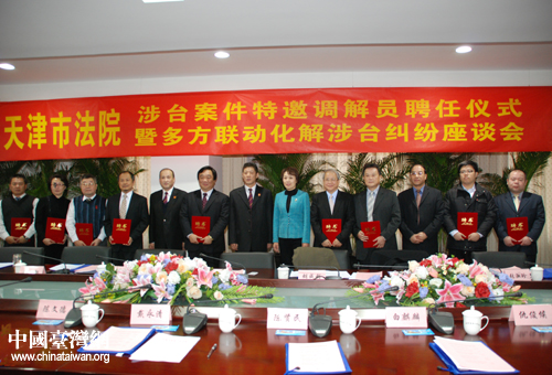 天津市高級人民法院舉行涉臺案件特邀調解員聘任儀式上,9名臺胞正式受聘上崗(圖片來源:天津市臺辦)