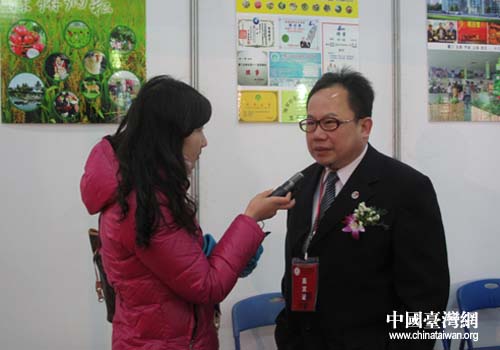 率隊參加展銷會的臺灣海峽農業基金會董事長黃一鐘接受媒體采訪(荊州市臺辦通訊員 張青松 攝)