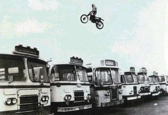 臺灣“飛車大王”呂慶安在1983年創下摩托車飛越14輛巴士的世界紀錄,不料他在除夕晚間騎腳踏車外出訪友,卻被同向摩托車撞死,親友不勝欷噓。 (圖片來源:臺灣《聯合報》)