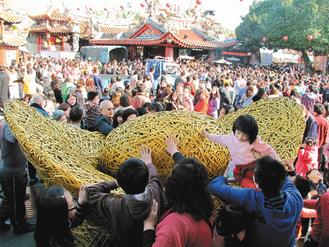 云林北港武德宮財神爺廟涌進大批人潮,大家爭相撫摸鎮殿大元寶,希望財運亨通。 來源:臺灣《中國時報》