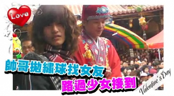 中國臺灣網2月14日消息 據臺灣媒體報道,彰化縣鹿港城隍廟昨天舉辦一場別開生面“男丁拋繡球找女情人”活動。男主角潘冠志拋出的繡球,被臺下一名17歲高二女生葉愉萍接到。葉愉萍上臺后,面對主持人藝人蔡閏詢問后說:“愿意交往試看看!”,立即獲得臺下民眾熱烈的掌聲和祝福。