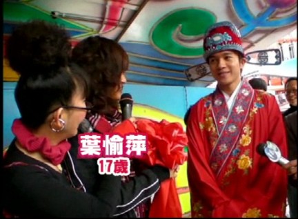 帥哥潘冠志只好再拋第二次,結果接到繡球的女主角是17歲、就讀高二的女生葉愉萍。葉愉萍說:“剛剛拜完城隍爺走出廟門,在路過舞臺前時就接到一顆紅色大繡球,是發生什么事?”等到她被半推半就請上臺后才知道是在舉辦“拋繡球”活動,直說真的好像是接到“天上掉下來的禮物”。