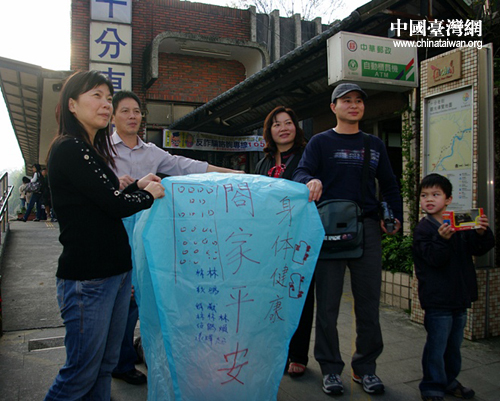 天燈也可像風(fēng)箏般以繩子系著施放。 臺灣花布與天燈結(jié)合,成為漂亮的燈飾,頗受民眾青睞。 在十分車站前留影,是觀光客來平溪最喜歡的取景點。 第1頁第2頁第3頁