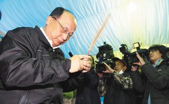 臺(tái)中市長(zhǎng)胡志強(qiáng)昨天到殯儀館向臺(tái)中夜店大火中不幸罹難者上香,他沉重地說(shuō)“大悲無(wú)言”,會(huì)全力照顧家屬。圖片來(lái)源:臺(tái)灣《聯(lián)合報(bào)》