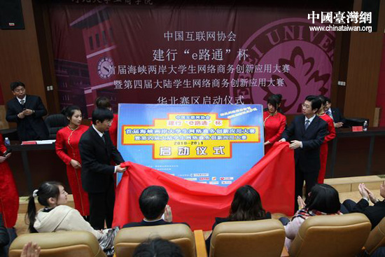 中國臺灣網3月10日保定消息 隨著中國建設銀行河北省分行副行長周小知與河北大學副校長郭健徐徐揭下牌匾上的喜慶紅布,“e路通首屆海峽兩岸大學生網絡商務創新應用大賽暨第四屆大陸大學生網絡商務創新應用大賽”(以下簡稱“大賽”)華北賽區活動,今天在河北大學宣告正式啟動。大賽主辦方和河北大學、河北農業大學、中國建設銀行、海爾集團總部、中國移動飛信、西祠胡同網站、敦煌網等協辦單位代表,以及學生代表等共300余人參加了大賽華北賽區的啟動儀式。