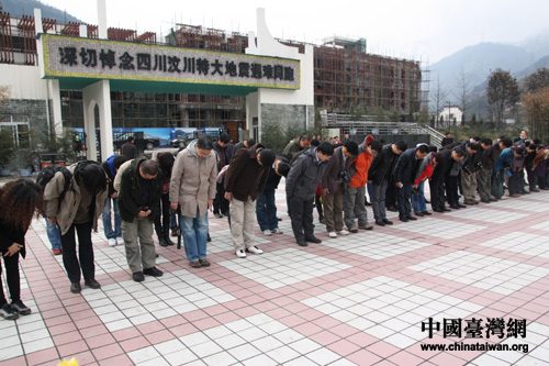 中國(guó)臺(tái)灣網(wǎng)3月26日四川汶川消息 日前,參加四川地震災(zāi)區(qū)宣傳考察活動(dòng)的全國(guó)網(wǎng)絡(luò)媒體高層一行,來到了“512”汶川地震震中的映秀鎮(zhèn)。在漩口中學(xué)紀(jì)念遺址前,全體人員懷著沉痛的心情向死難者默哀,并獻(xiàn)上菊花。