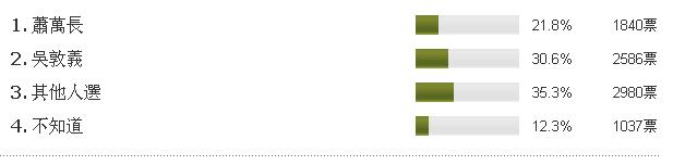 臺灣Yahoo!奇摩網在馬英九2012副手民調選項中設置4個選項。一是支持蕭萬長;一是支持吳敦義;一是其他人選;一是不知道。經過8443人的投票,結果于今日出爐。