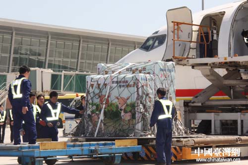 “繁星”、“點點”、“喜羊羊”、“樂羊羊”順利抵達威海機場。圖為機場地勤人員準備接“寶貝”們下飛機。(中國臺灣網 劉海偉 攝)