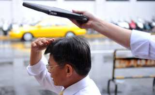 前高雄縣長(zhǎng)楊秋興離開臺(tái)灣“高等法院”時(shí)遇上午后雷陣雨,幕僚用平板計(jì)算機(jī)為他遮雨,形成有趣景象。圖片來源:臺(tái)灣“今日新聞網(wǎng)”