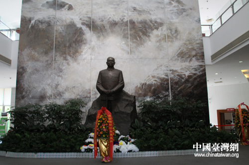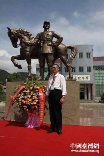 謝晉元將軍的兒子謝繼民在父親銅像前獻花籃。(中國臺灣網 馮江 攝)