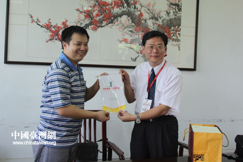 武漢大學學生會負責人與臺灣十大杰出青年基金會團長彭銘淵互贈禮物(中國臺灣網 李丹 攝)