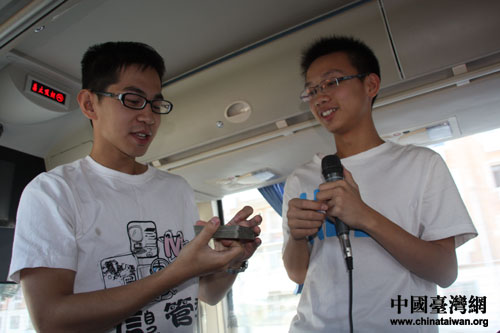 呂國豪在車上為大家表演撲克魔術。(中國臺灣網 宿靜 攝)