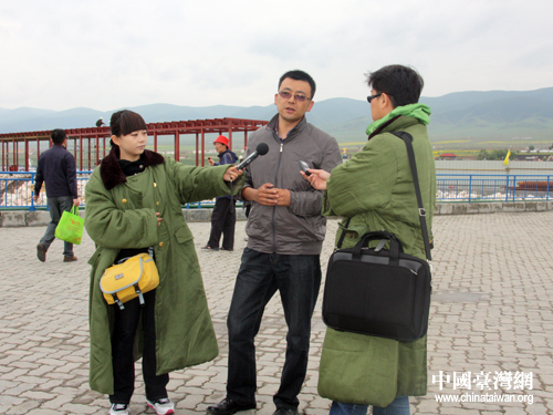 青海湖景區(qū)旅游管理處工作人員向兩岸記者介紹青海湖概況。兩岸媒體記者穿著租來的軍大衣,仍阻擋不了青海湖襲來的陣陣涼風(fēng)。(中國臺灣網(wǎng) 楊云濤攝)