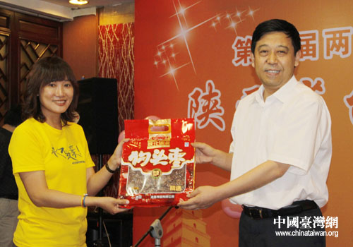 陜西省臺辦主任閆超英向志工代表贈送陜西特產(chǎn)(陜西省臺辦 張群莉 攝)