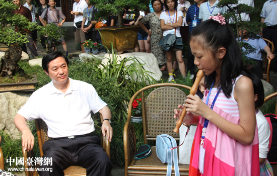 劉奇葆書記認真聆聽黃繹心小朋友的笛子演奏。(中國臺灣網(wǎng) 趙輝 攝)