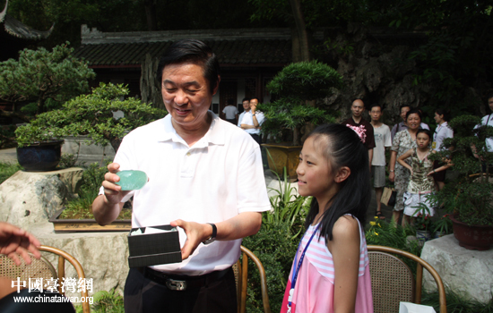 黃繹心小朋友將象征事事如意的琉璃柿子送給劉奇葆書記。(中國臺灣網(wǎng) 趙輝 攝)