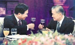 當年陳水扁在臺北賓館以晚宴款待臺灣五大機構負責人,晚宴時,陳水扁特別先向剛從榮總檢查身體回來的唐飛敬酒,顯示他一度“挺唐”的決心。(圖片來源:臺灣《中國時報》)