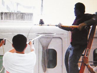 這只獼猴大鬧三小時(shí)后,圍捕人員射出四支麻醉箭,獼猴中箭跌落高鐵車廂上。(圖片來源:臺(tái)灣《聯(lián)合報(bào)》)