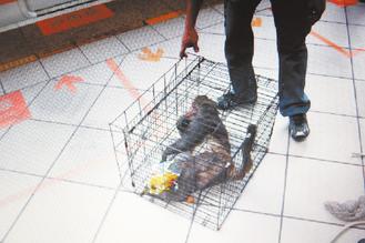 高雄市消防局表示,昨天上午九時(shí)九分,左營(yíng)站員工發(fā)現(xiàn)第三站臺(tái)內(nèi)側(cè)梁柱上有只獼猴亂竄,立即出動(dòng)多人,攜帶捕獸夾、捕獸網(wǎng)及鐵籠趕往。獼猴非常機(jī)警,見一群人“來意非善”,在站臺(tái)梁柱間跳來蕩去,再由站臺(tái)外側(cè)往大廳梁柱移動(dòng),把后面“始終慢一步”的圍捕人員急得團(tuán)團(tuán)轉(zhuǎn)。 圍捕人員力斗不過想智取,拿出香蕉誘捕,獼猴跳下來?yè)炱鹣憬洞罂诔裕珖度藛T靠近,獼猴立即跳上梁柱,亂得他們只好干瞪眼。
