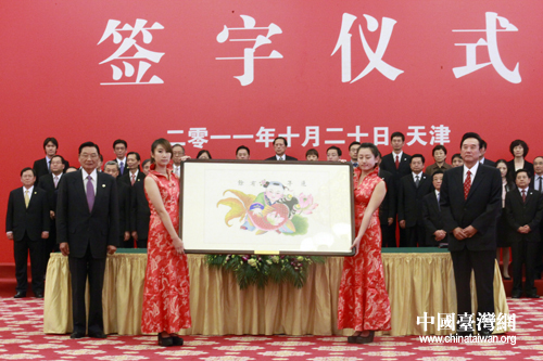 海協(xié)會(huì)會(huì)長陳云林向海基會(huì)董事長江丙坤贈(zèng)送禮物“連年有余”。(中國臺(tái)灣網(wǎng) 陳佳慧 攝)